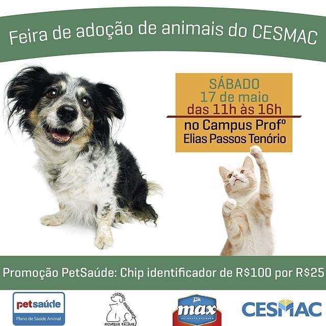 Feira de adoção de animais! Sábado 17 Maio, de 11hs as 17hs no Cesmac (Campus IV) na rua do colégio sacramento! Com microchipagem de animais a R$25,00 , iremos colocar um chip identificador no animal! Teremos brindes para animais adotados! Se vc não pode adotar ajude comprando uma camisa da causa animal por apenas R$40,00...ou doe Ração!!!